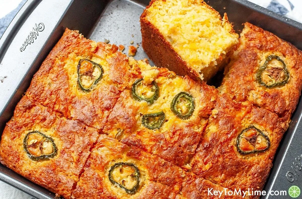 Straight from the pan and to your plate, Mexican cornbread is a comfort food that pairs well with tamales and chili con carne. It is fluffy and buttery like traditional southern cornbread but contains fresh jalapenos, melted cheese and corn.